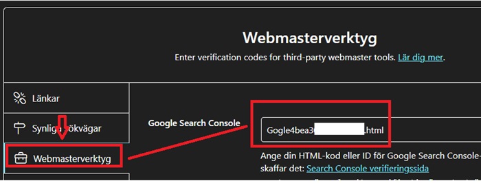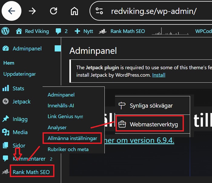 Om din sajt körs på WordPress kan du använda ett plugin som Yoast SEO eller Rank Math för enklare verifiering (lägg in koden i headern istället). Annars fungerar filmetoden perfekt för Göteborg-baserade hosting som Oderland eller Loopia. Här visas med Rank Math i WordPress. (Ladda ner Rank Math som Plugin)